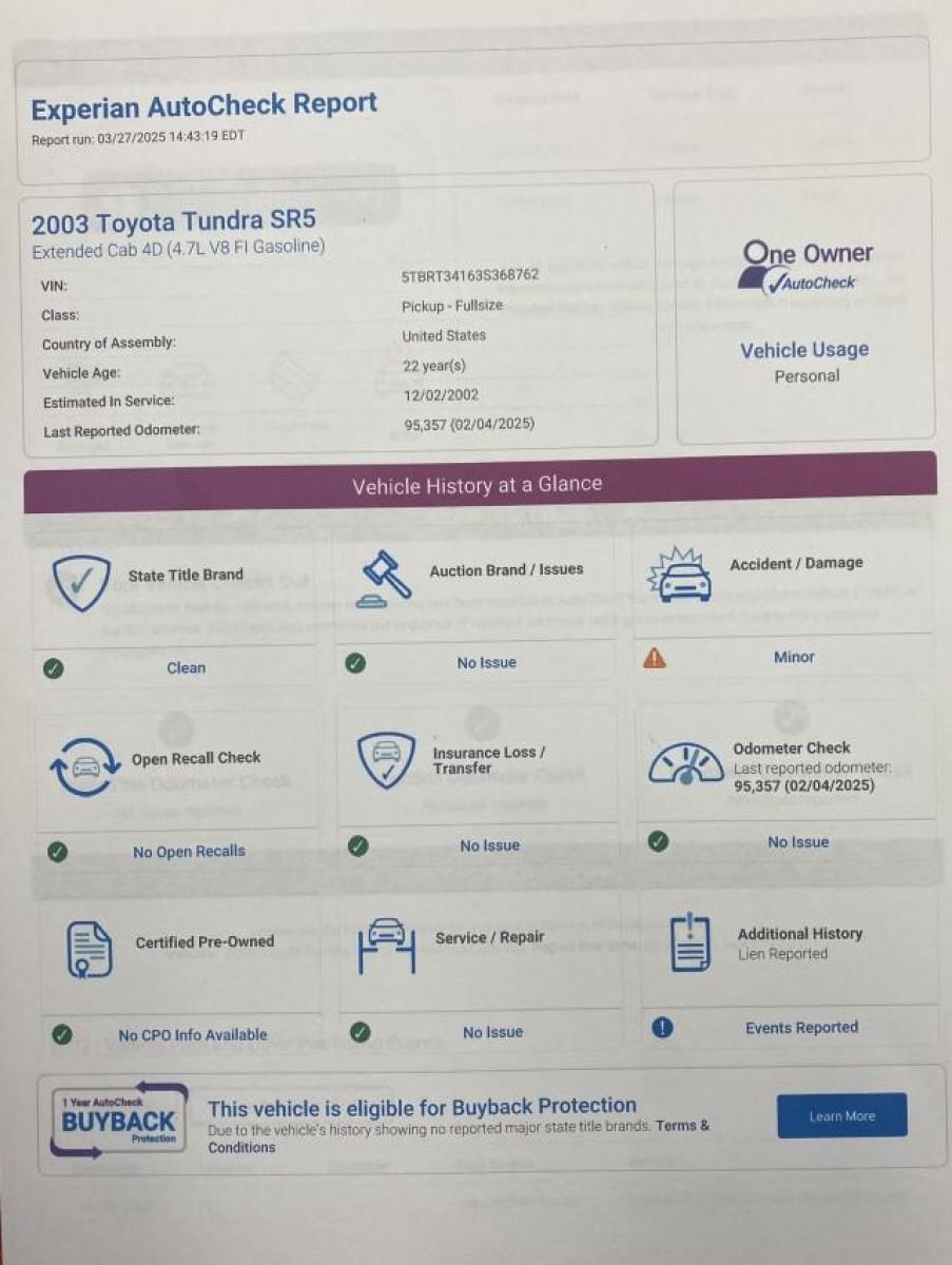 OUR WEBPAGE FLORIDACARS1.COM HAS OVER 100 PHOTOS AND FREE CARFAX LINK 2003 TOYOTA TUNDRA SR5 VIN: 5TBRT34163S368762 4 DOOR EXTENDED CAB PICKUP 4.7L V8 F DOHC 32V GASOLINE REAR WHEEL DRIVE WE HAVE 1 OWNER CLEAN TITLE WITH NO BRANDS Highlighted Features Bed Liner Cloth Seats ABS Brakes Automatic Transmission Power Locks AM/FM Stereo CD Audio Power Mirrors Air Conditioning Cassette Player Power Windows Presenting one of the finest Toyota Tundra's weve ever listed! This incredible 1-owner, Florida title vehicle is a true standout, with a low 95,357 miles, making it one of the lowest-mileage example currently available in the country. Finding a Tundra in such great condition with these miles is becoming increasingly rare, so dont miss your chance to own this exceptional vehicle. This truck is road-ready and in outstanding shape. We welcome you ordering an inspection before shipping if you have any concerns, as we pride ourselves on transparency and want you to feel completely confident in your purchase. The pictures you see are of the actual vehicle, so you know exactly what youre getting. Key Features: CARFAX Report reveals 31 service records, and shows 1 accident, there is no sign of any damage .Auto checks shows 2 minor accidents ,no sign of any damage. This Toyota drives tight, smooth, and straight, offering a comfortable ride. The vehicle is finished in a high-gloss shine, and has beautiful cloth seats. What Youll Get: 3 keys and 2 key-fobs for added convenience. A Beach Bag Package, which includes a custom beach towel, is yours with this purchase! (Just remind us to include it!) Our Commitment to Quality: With over 40 years in the business, we stand behind every vehicle we sell. We welcome all inspections and guarantee that if any issues are found, we will correct them prior to shipping, so you can enjoy peace of mind. We are transparent about the fact that, as with all used cars, there will be some wear and tear on parts like tires, brakes, shocks, and ball jointsbut rest assured, nothing is broken and the car is in working condition. With 9 lifts and 2 state-of-the-art down-draft paint booths, our full-time mechanic and experienced body shop team at our 22,000-square-foot certified center are always ready to ensure that any minor imperfections are addressed at cost, ensuring your car is in tip-top shape. Shipping Options: We can arrange shipping to anywhere in the country or internationally. Whether youre ready to book a flight and make a vacation out of picking it up or prefer to have it shipped directly to you, well make it as easy and affordable as possible. This Toyota Tundra is an amazing find, offering the comfort and dependability youre looking for. Dont miss out on this rare opportunity to own a true classic, it won't last long! Contact us today to make this beauty yours! WE HAVE OVER 100 PICTURES OF THIS VEHICLE ANY QUESTION PLEASE CALL FRANK AT 954 422 2889 ATTENTION ALL EBAYERS WE HAVE OVER 100 PICTURES YOU HAVE TO OPEN THIS TAB SEE FULL ITEM DESCRIPTION LOCATED AT BOTTOM LEFT TAB OF FIRST PAGE Please look at all available pictures online to see all the great qualities this .... has to offer. We show the absolute best representation of the vehicle without any photo editing. As with any older model automobile, this vehicle may have minor blemishes or scratches that will be pointed out in the available pictures. If you have any questions in regards to our vehicles, please do not hesitate to ask. Our business is to help our clients find the right choice of car, truck or SUV to fit their needs. Also, if unable to visit our showroom, we will help you find the best transportation method necessary to deliver any vehicle directly to your driveway. Furthermore, the number of key(s) and key fob(s) is shown on our add as the next to last picture. The photo will clearly show if it is a single key or multiple keys. Century Motors of South Florida is not responsible for any additional key, key fob or key programming. Please check with your local dealership about cost and time frame for additional keys. Also, we are NOT responsible for Sunroofs! If we advertise a vehicle that has a sunroof we do NOT guarantee that it works. You can email prior to purchasing the vehicle to inquire on whether or not the sunroof works if the vehicle comes with one. PROTECT YOUR VEHICLE INVESTMENT and YOUR POCKETBOOK WITH A VEHICLE WARRANTY Being the majority of vehicles sold at Century Motors are 10-25 years old, we HIGHLY recommend protecting your investment with the purchase of a 24 to 36 month bumper to bumper warranty. While all of our vehicles are fully serviced upon delivery, its not a question of if your vehicle will break down, but when and who is paying it? As vehicle parts and service costs continue to skyrocket, it is imperative to protect your vehicle and give you peace of mind. CENTURY MOTORS of South Florida 100% POSITIVE BUYER FEEDBACK Located in beautiful sunny South Florida Annually ranked in the top 10 of over 15,000 auto dealers on e ba y motors. From our massive 50+ vehicle indoor showroom... To our retro inspired reception area... Our 22,000 sq ft fully staffed technician service center featuring 9 dedicated auto lifts, 2 downdraft paint booths, Spies Hecker perfect paint computerized blending lab and more... To the hand selected variety of vehicles we so proudly sell... Our owner's commitment to quality... And the many accolades it has won them within our industry... From humble and ambitious beginnings... To the success of today... WHAT DOES THE CAR FOX SAY? A 100% CARFAX GUARANTEED VEHICLE STATEMENT PLEASE VISIT CENTURY MOTORS OF SOUTH FLORIDA FOR ADDITIONAL VEHICLE PHOTOS, STATEMENTS, REPORTS, ETC. Please go to www.VisitFlorida.com to see more of what this magnificent state has to offer you today. Shop at the home of the COOLEST CATS IN SOUTH FLORIDA and get the hottest deals anywhere!!! NOTE: We will gladly arrange transportation for you and your guests from any reasonable location 